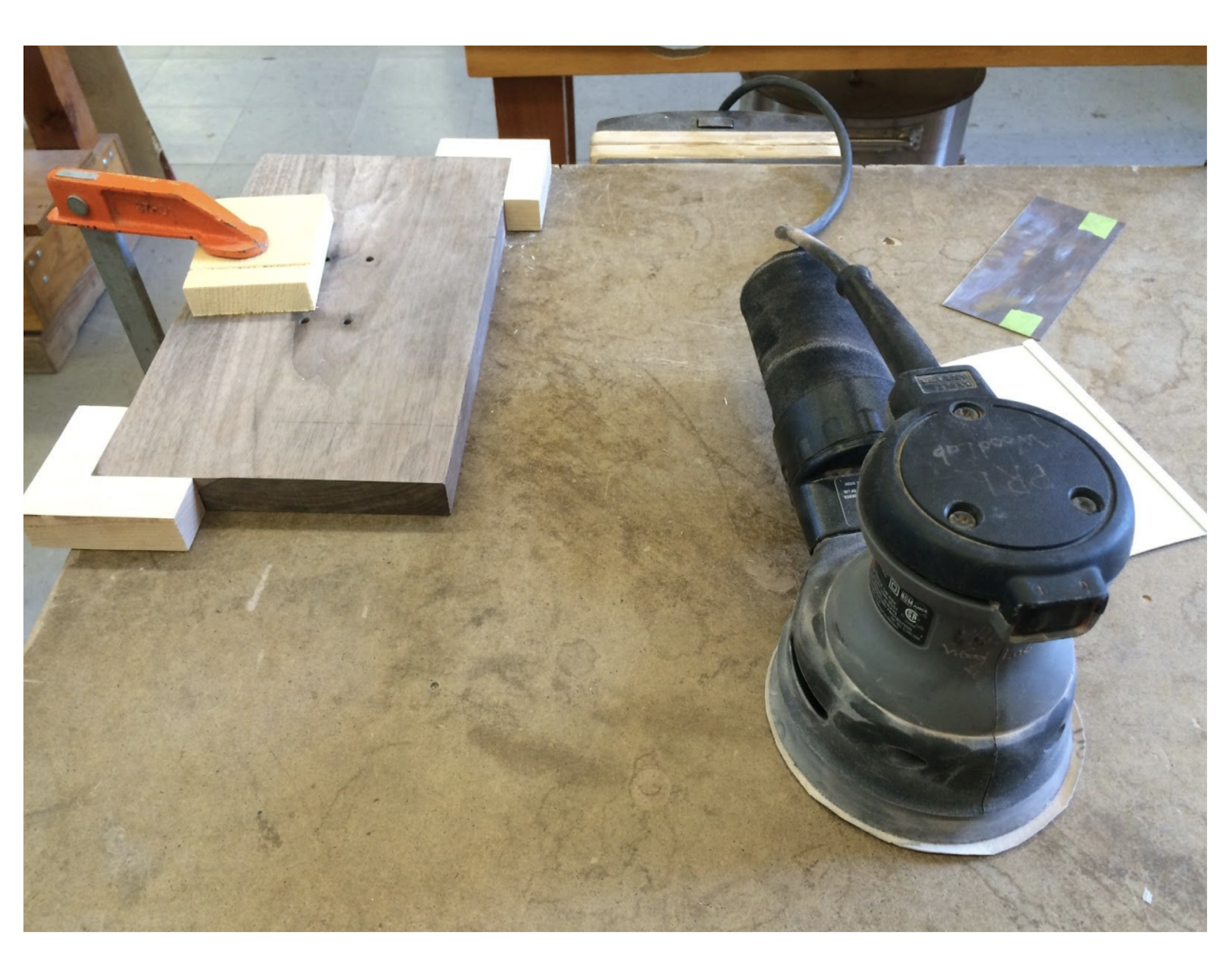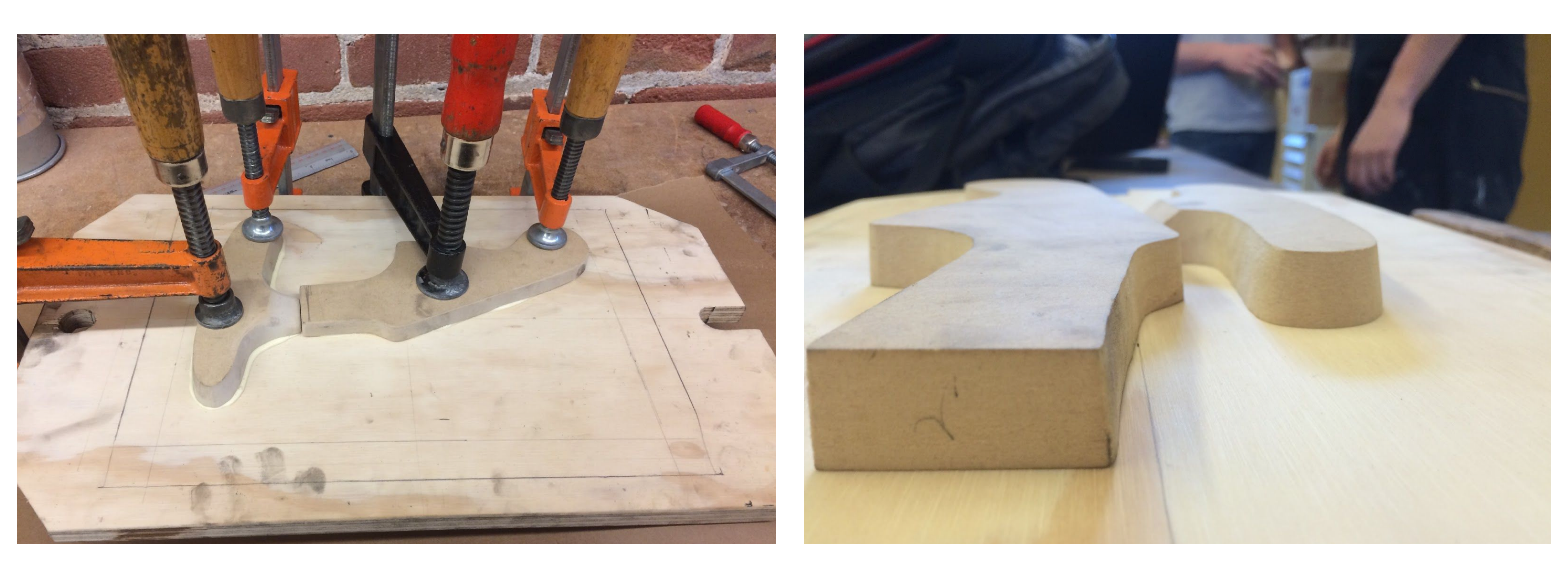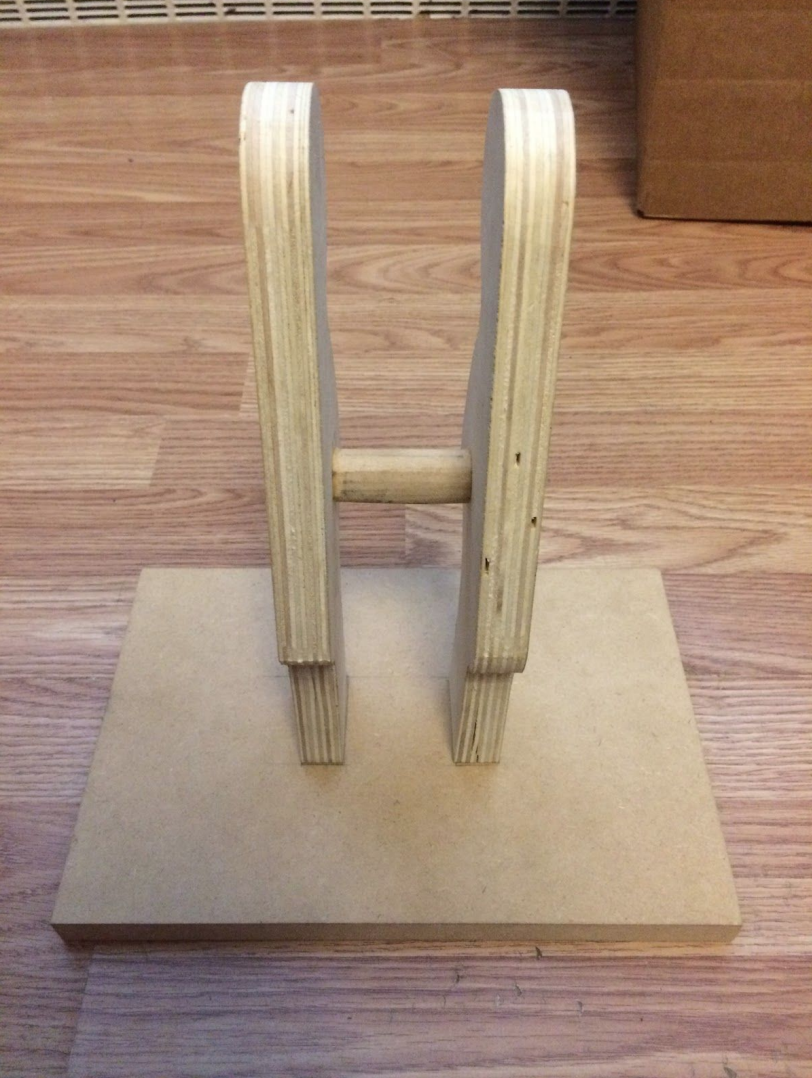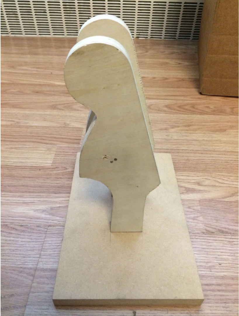 In order to create my prototype, I used a bandsaw and circular sanders to make the two wooden, Stratocaster headstock-shaped holders. I then attached them to a wooden backboard using wood screws and a hand drill, and joined a carved, (largely) cylindrical wooden piece between the two holders for increased stability. I used nails and wood glue to hold the cylindrical piece in place.