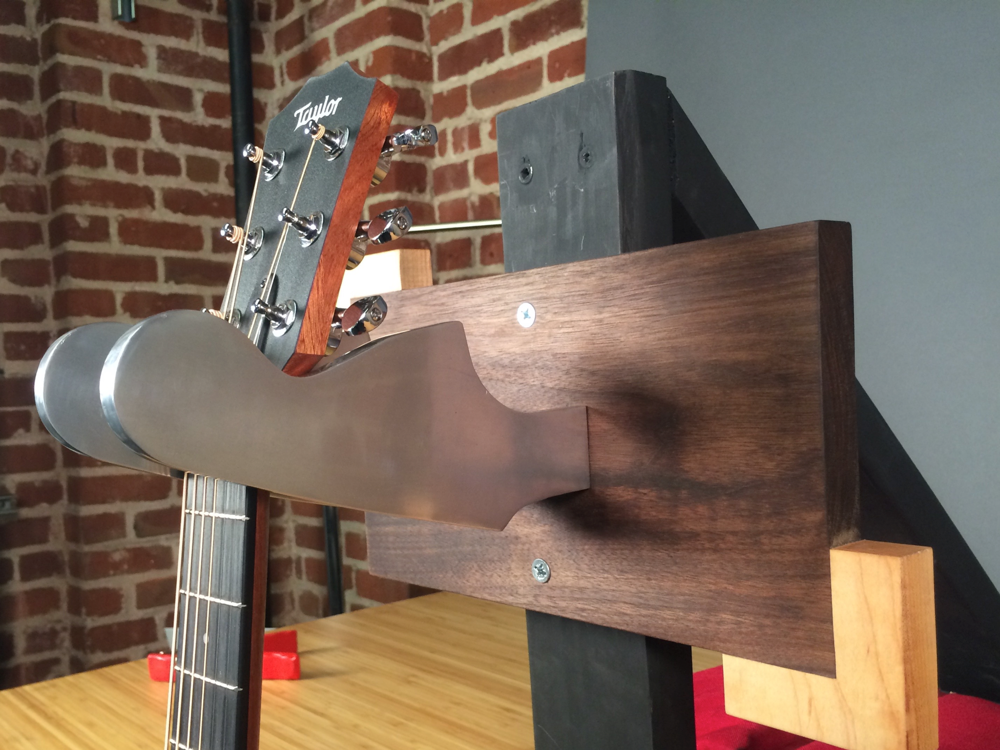 Stand by me serves as a guitar mount that takes advantage of the signature geometry of Fender Stratocaster headstocks. It uses two headstock structures to stabilize and mount a guitar onto a wall.