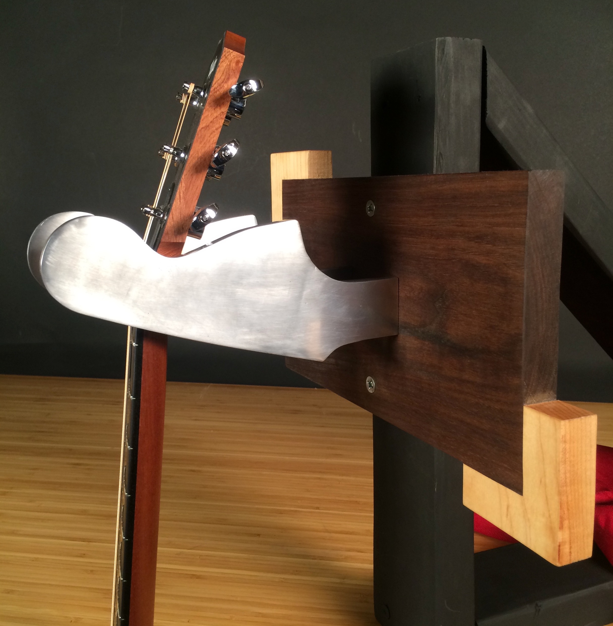 I specifically chose the design of the Jimi Hendrix tribute Stratocaster because of its geometry and large curvature - things that would allow a guitar to be placed with stability. However, I realized that I don’t need all the breadth that the original shape has, since this breadth was unnecessary added weight. To account for this, I reduced the dimensions where there is no contact with the guitar, so that the overall weight of the metal was lowered and there was less load on the wooden base that runs perpendicular to the headstock projections.