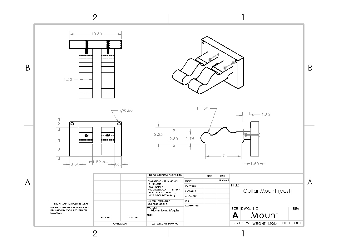 The final product would have wood-metal interactions, so the joints would need to be changed accordingly. I planned on having a tapped hole in the cast piece (headstock) and a clearance hole in the wood in order to screw the two together from the back of the wood piece (face that is in contact with the wall). With regards to the type of wood to use, I considered using two american hardwoods (one dark and one light) to create a striped design while the metal I used was an aluminium alloy, something that is both light and durable.
